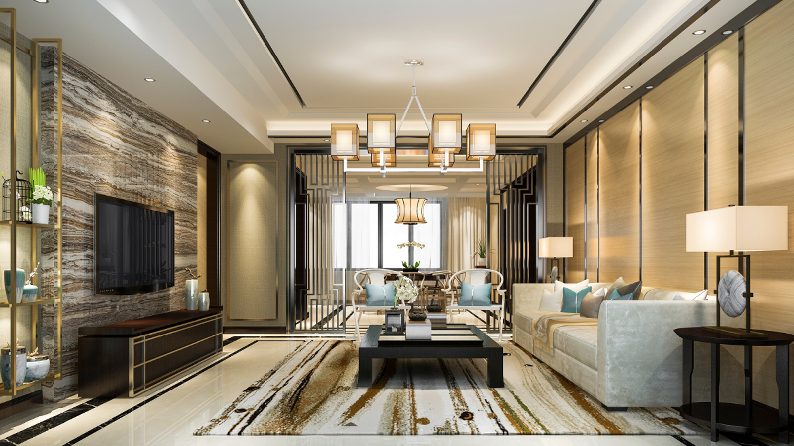 Spacious Vintage Living Room with Crema Marfil Floor Design
